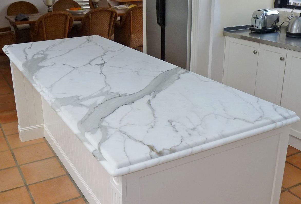 Столешница кухонного острова изготовлена из мрамора Calacatta Vagli - классики итальянской каменной промышленности. Это белоснежный скрытокристаллический мрамор с легким свечением и неоднородным рисунком светло-серых прожилок. Является одним из самых востребованных видов природного камня.