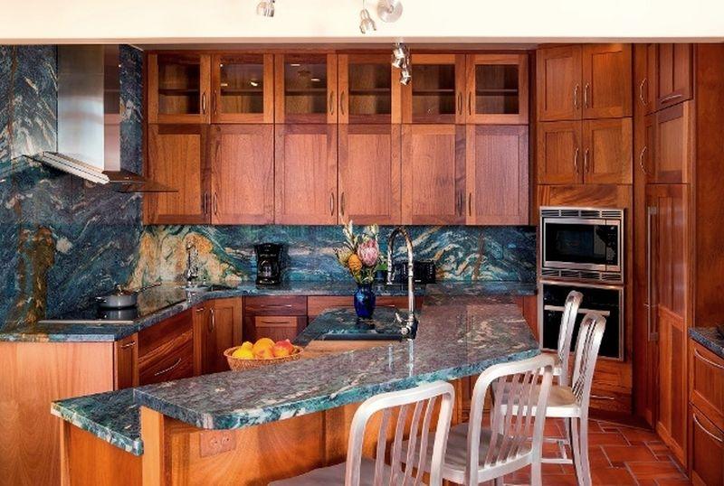 Этим камнем покрыты все столешницы кухни: как по периметру рабочей зоны, так и на двухуровневой барной стойке, расположенной по центру. Им же облицованы стены.