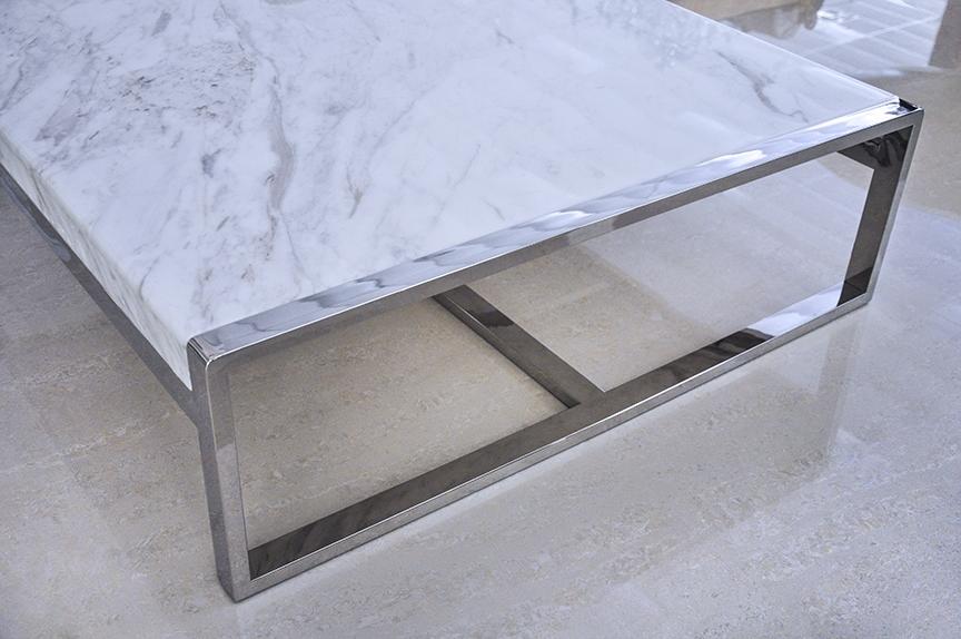 Элегантный и простой кофейный столик, состоящий из металлического каркаса и квадратной плиты мрамора Volakas. Удивительно, почему современный дизайн интерьеров так мало внимания уделяет таким эргономичным и стильным изделиям..