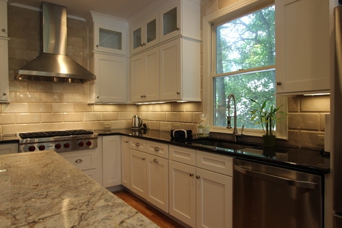 Стены кухни облицованы прямоугольной полированной плиткой бежевого мрамора Crema Nova. Обратите внимание кладку плитки – она напоминает кирпичную. Мрамор Crema Nova гармонично смотрится в любом интерьере, однако близость кухонных рабочих поверхностей, особенно плиты, не очень благоприятна для его внешнего вида.