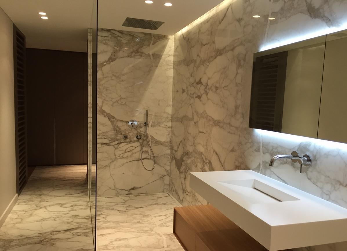 Ключевые особенности дизайна: простая геометрия линий, минимализм в декоре, обилие пустого пространства. Для пола и стен был использован мрамор Calacatta Gold в формате крупных продолговатых плит с полированной фактурой. Дизайнер выбрал плиты с ярко-выраженной прожилковатостью.