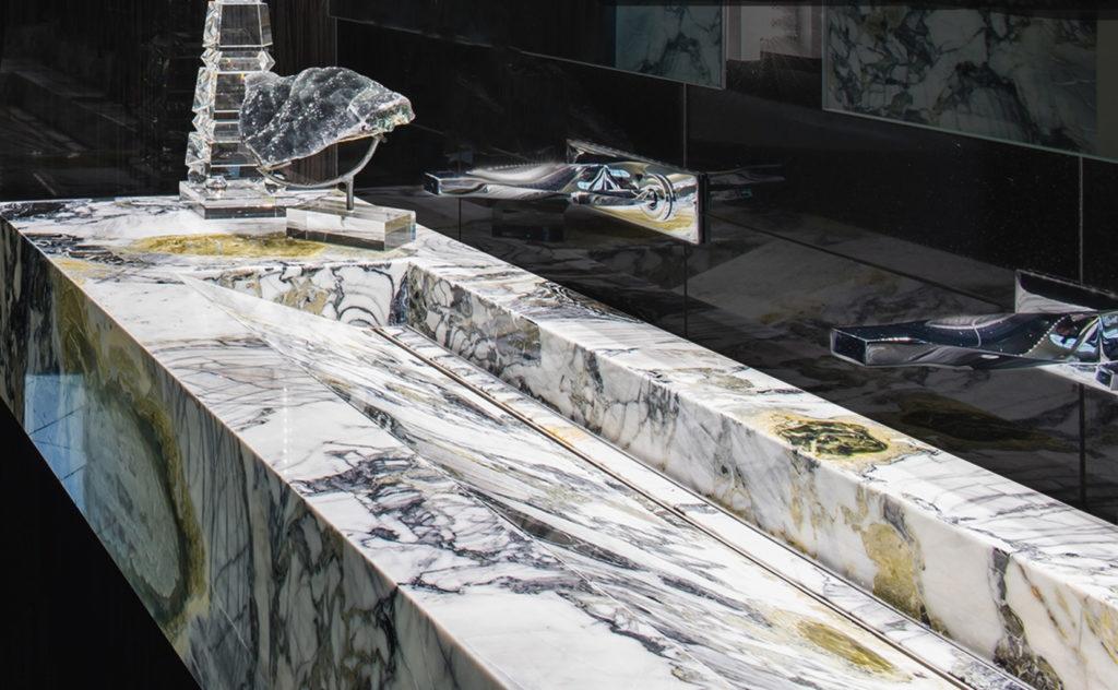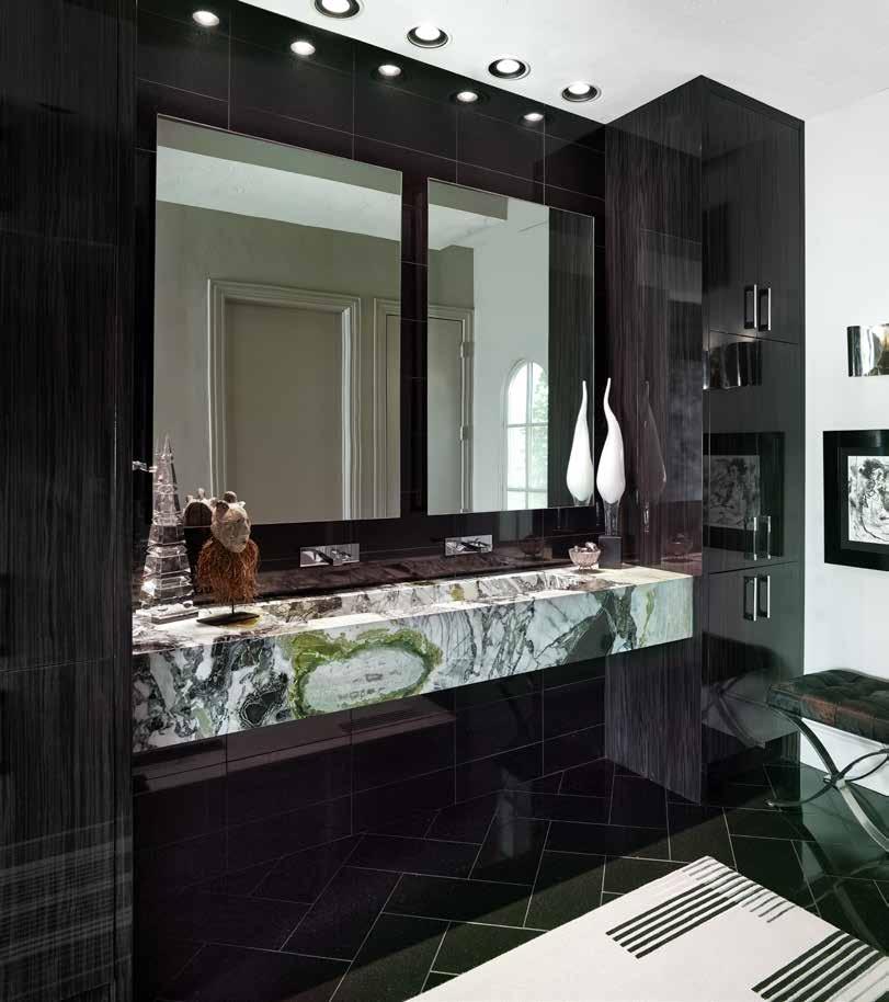 Из него выполнена продолговатая раковина-столешница с диагональным дном. Им облицована часть стены - для этого использовали две плиты с симметричным рисунком, образовав раскладку "бабочка".