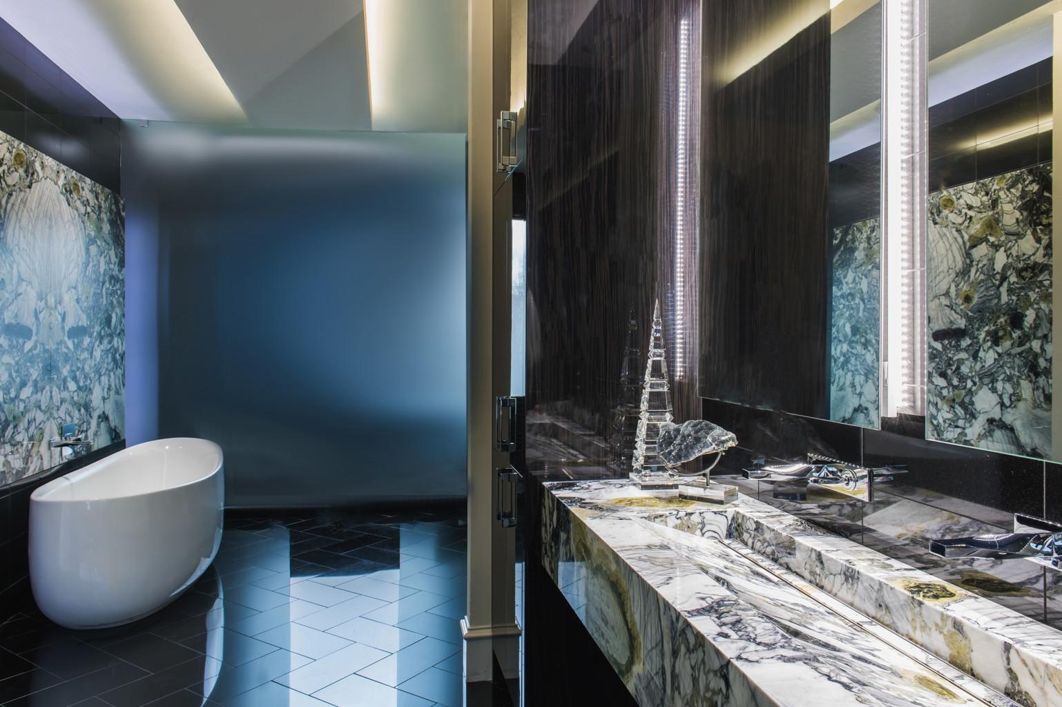 Перед нами авторская визуализация ванной комнаты. Проект в премиум-сегменте подразумевает смелый и выверенный дизайн и использование самых качественных материалов. Преобладает темная отделка деревом и черным камнем, а на ее фоне особенно выразительно смотрится редкий мрамор White Beauty. Благородный и яркий, как полотно из самоцветов, этот камень привносит ощущение роскоши и праздника.