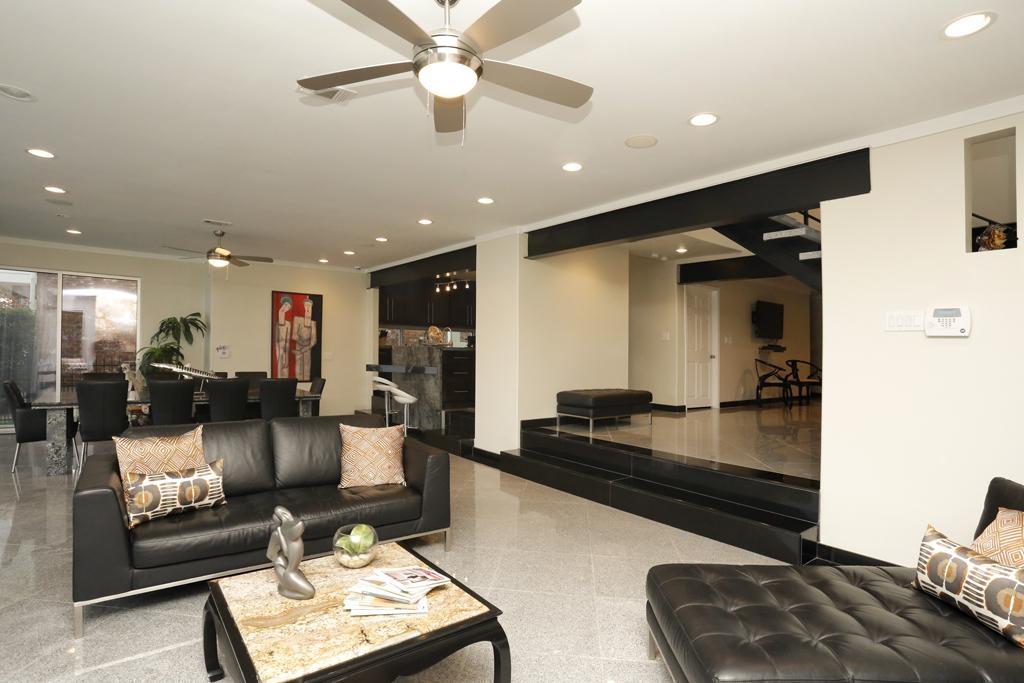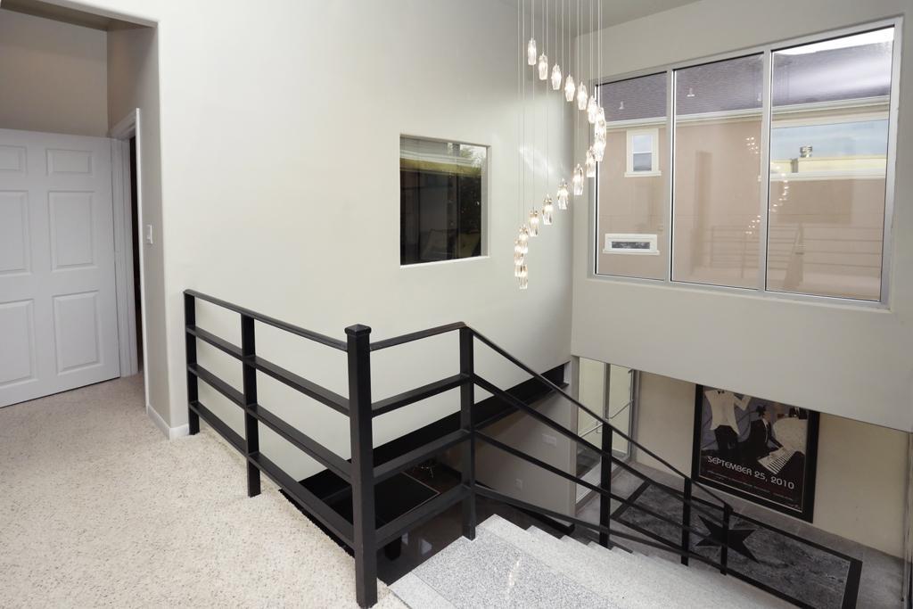 Также из этого камня вырезаны подвесные ступени лестницы, ведущей на второй этаж. Нижняя площадка дополнительно украшена каменным панно, собранным из серого и черного гранита.