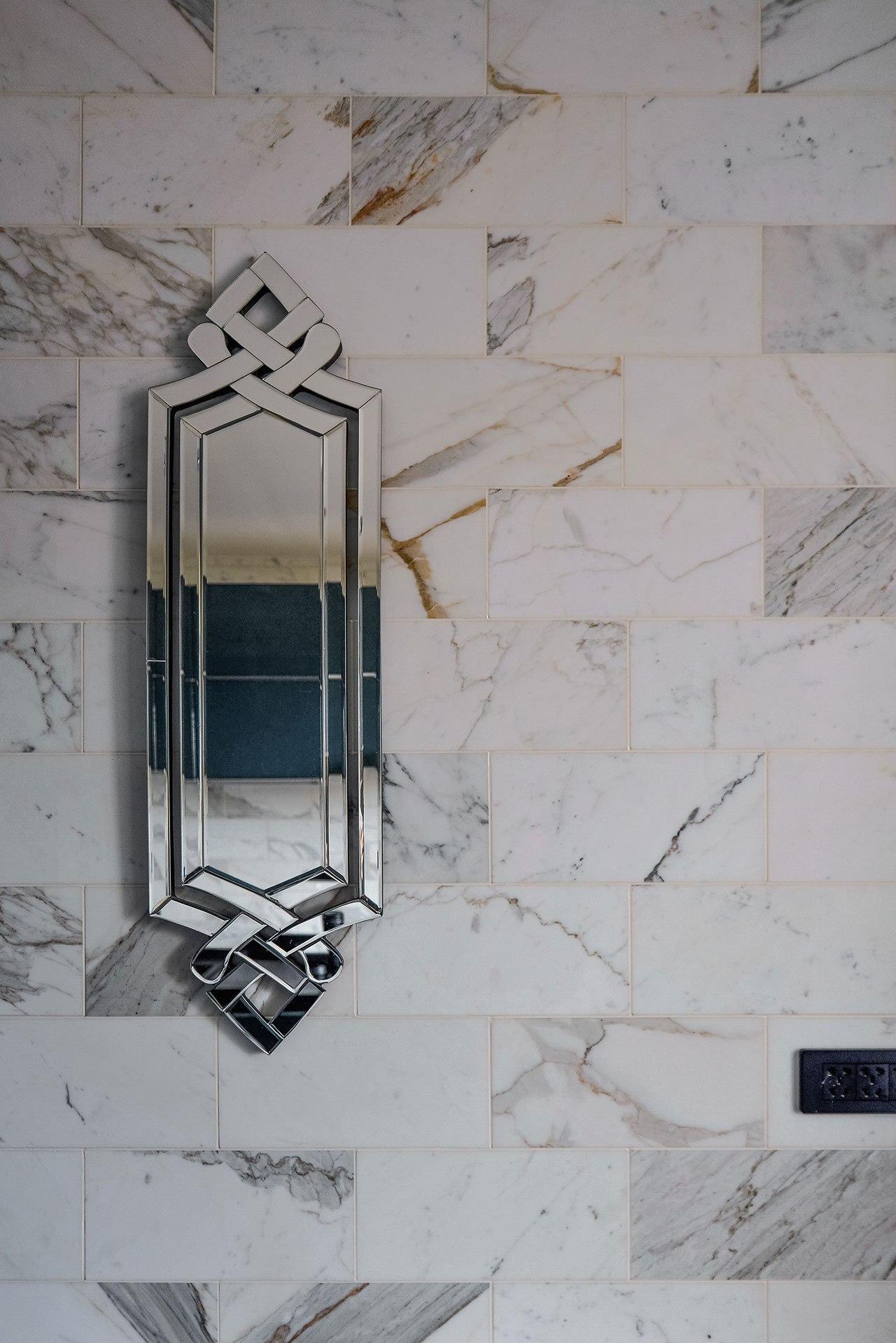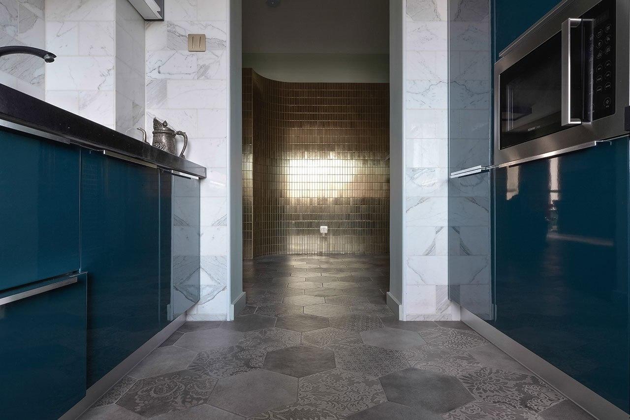 Нам особенно интересен дизайн кухни - ее стены покрыты плиткой белого мрамора лучших итальянских сортов: Bianco Carrara, Bianco Gioia, Calacatta Vagli, Calacatta Gold и Bianco Statuario. Установленная в хаотичном порядке плитка создает живописный фон из разнонаправленных серых и золотистых прожилок.
