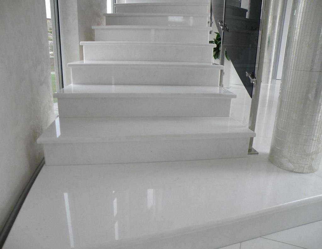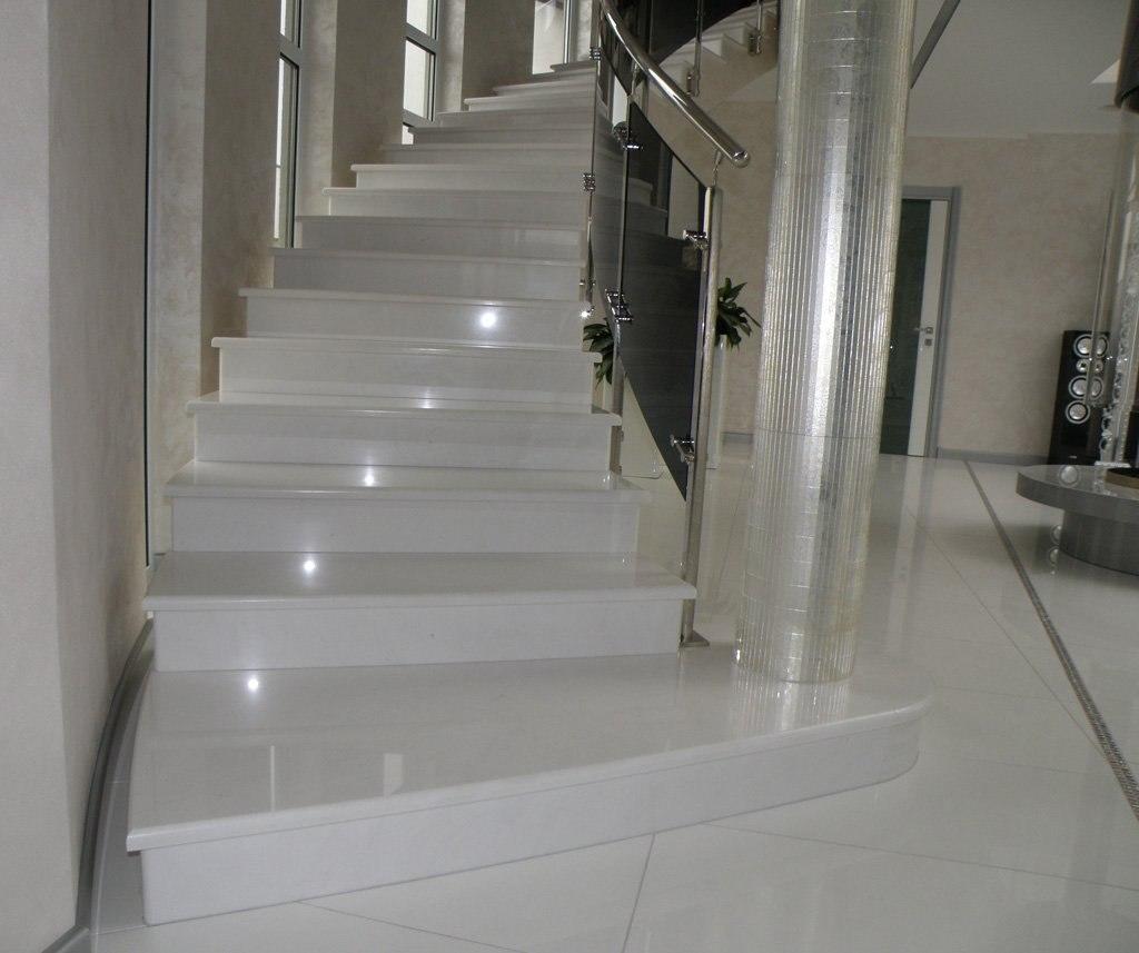 Все элементы лестницы облицованы полированным мрамором White Crystal - ступени, подступенки и боковые элементы. За счет радиальной формы и сглаженного профиля ступеней, вид конструкции заметно смягчен, сглажен.