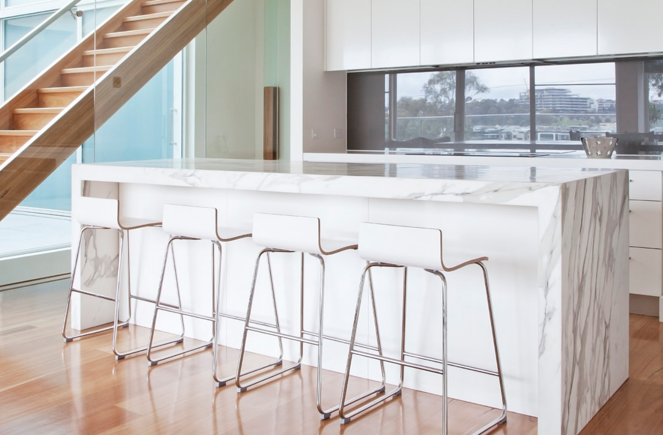 Интерьерный проект современного загородного дома с гостиной-студией. Пространство оборудовано барной стойкой, выполняющей роль кухонного стола. Стойка покрыта толстомерами мрамора Calacatta Vagli в виде П-образной конструкции.