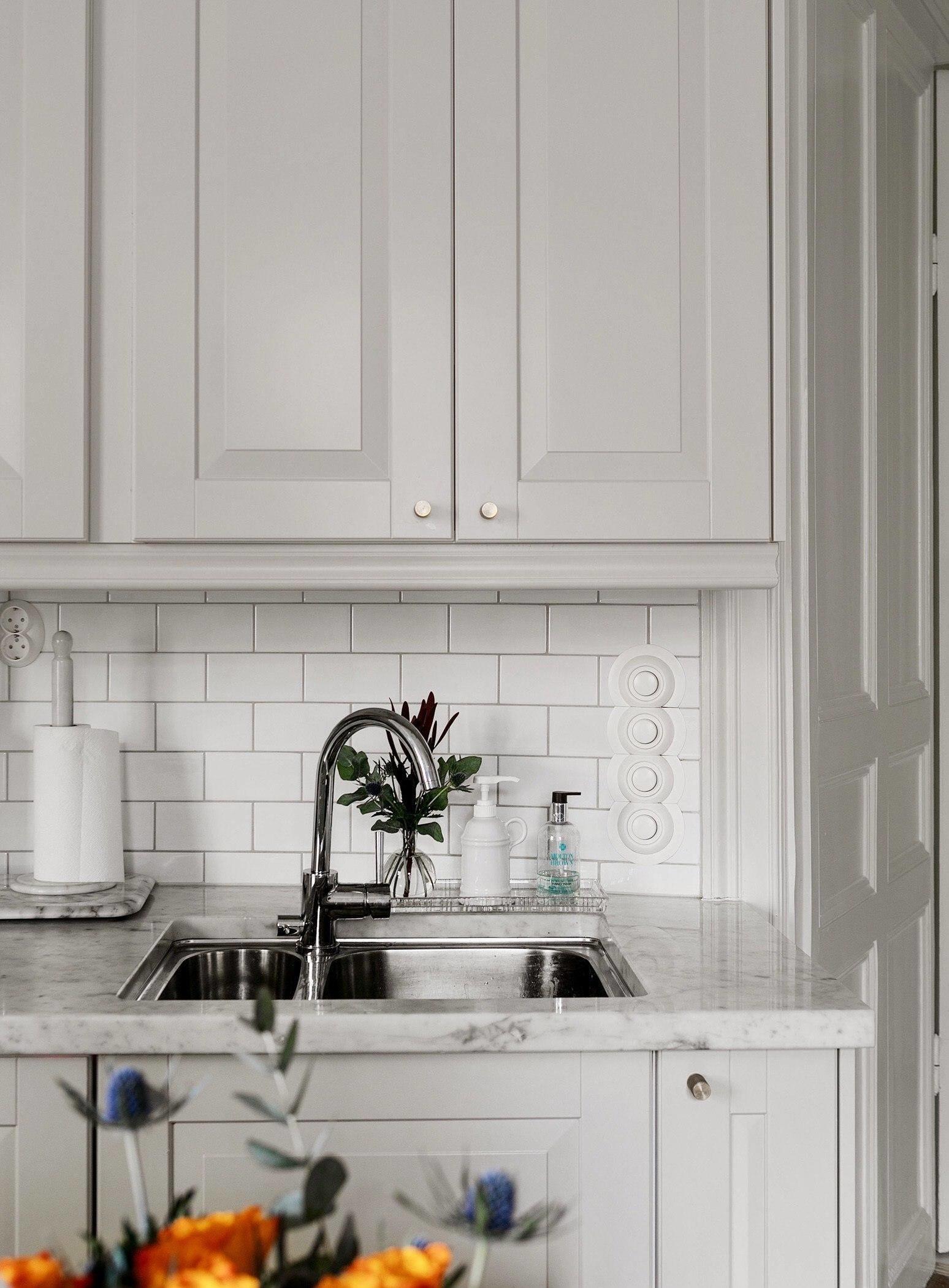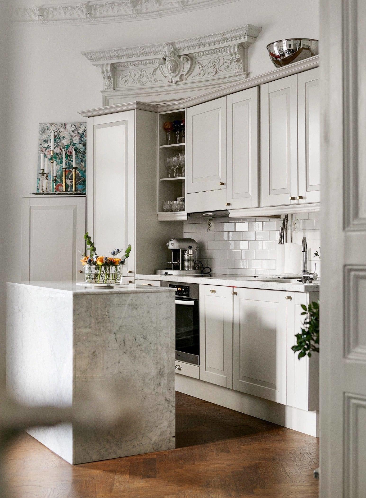Кухонный остров с четырех сторон покрыт полированными плитами легендарного каррарского мрамора. Им же облицованы столешницы рабочей зоны по периметру.