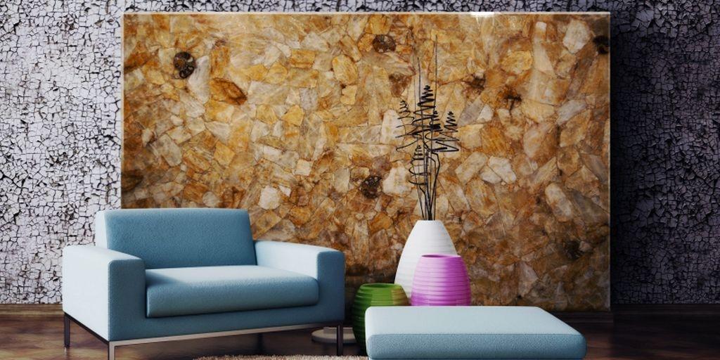 Стеновая панель Yellow Quartz выполняет роль декоративного панно. Этот камень яркий и самодостаточный. Такое решение подходит ценителям минимализма в дизайне.
