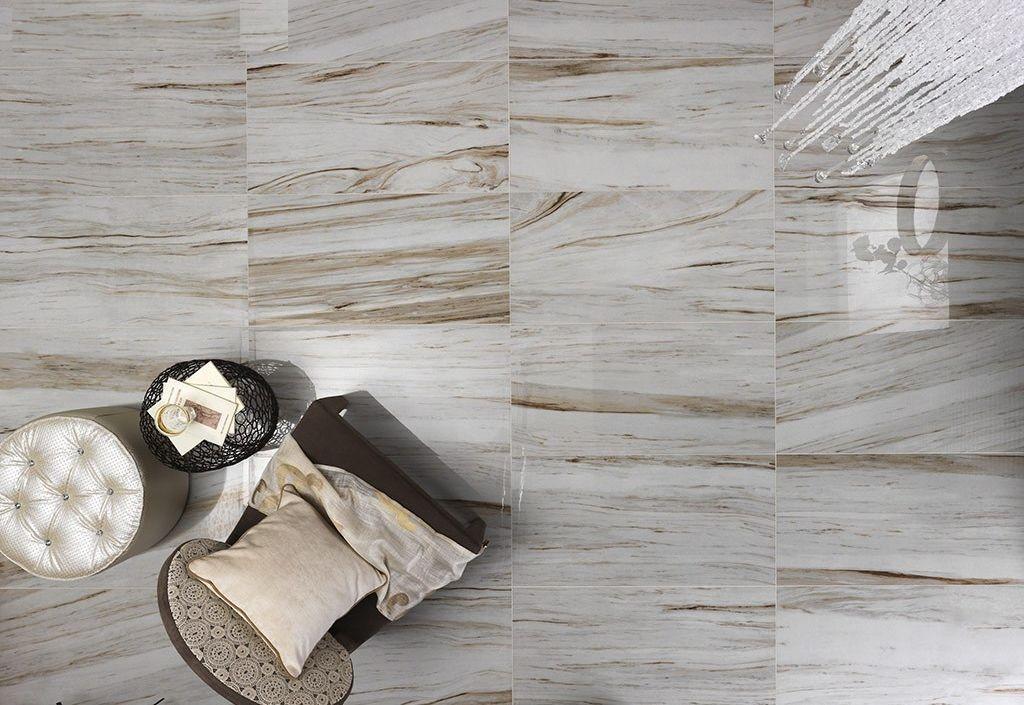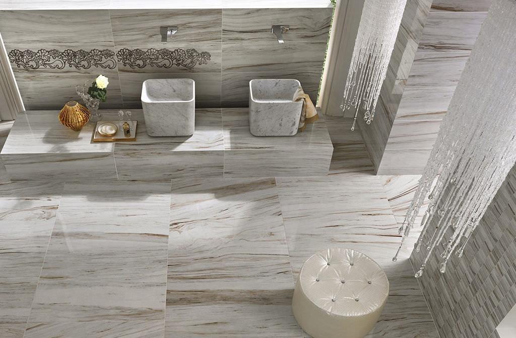 Для отделки стен, пола, низкой столешницы для раковин использован полированный мрамор Calacatta Zebrino. Была тщательно отобрана плитка крупных размеров с четкой горизонтальной полосчатостью (распиловка Vein Cut). К слову сказать, такая отделка помогает визуально расширить помещение.