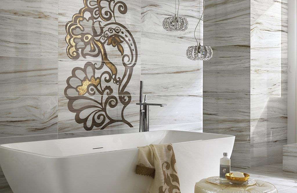 Декоративные элементы из хрусталя и металла, мебель и настенные орнаменты довершают интерьер ванной комнаты, придают ему законченный вид.