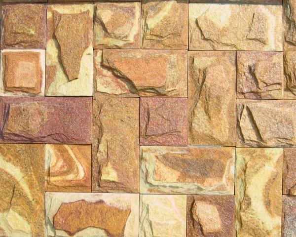 Стена сложена грубыми кирпичиками породы Златолит бежевый. Этот камень часто используется для отделки фасадов. Однако такая стена может смотреться весьма органично и в интерьере, при уместности ее в общей концепции.