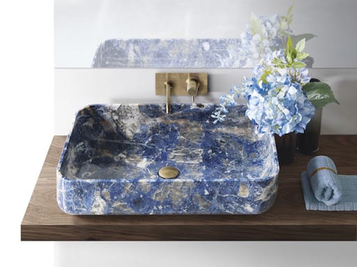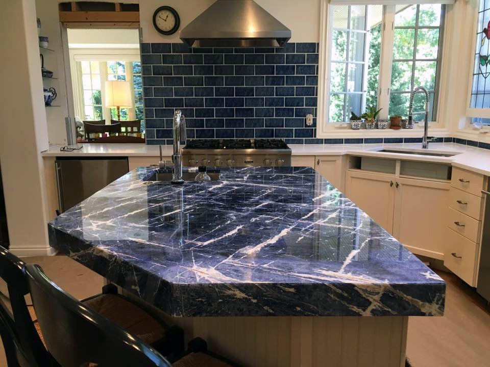 Слэбы содалита ценятся среди дизайнеров за красивый небесно-голубой цвет и сложную, неравномерную структуру с обилием прожилок различных оттенков.