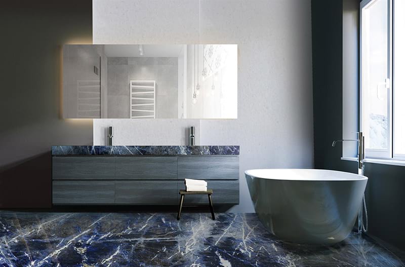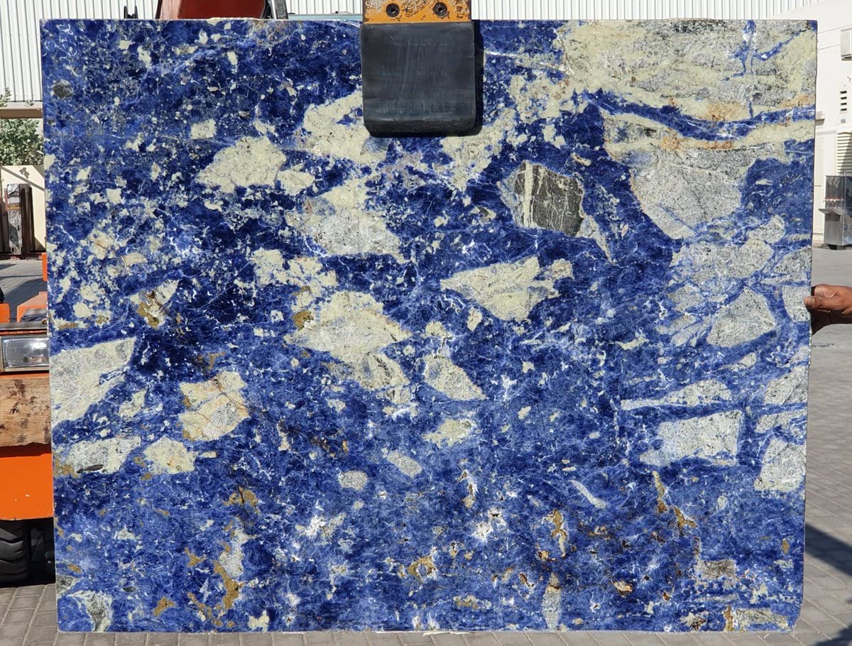 Используемый в интерьере минерал голубого цвета добывается преимущественно открытым способом. Крупные фрагменты распиливаются на слэбы и цементируются сверхпрочным раствором, благодаря чему плиты приобретают дополнительную прочность. Площадь слэбов обычно не превышает 5 м².