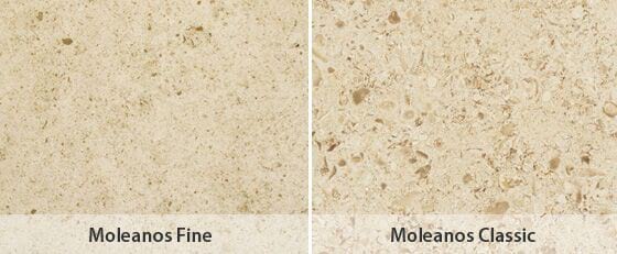 Существует два вида бежевого Молеаноса - Classic и Fine, отличаются они зернистостью вкраплений. Классик - более грубый камень с крупными вкраплениями окаменелостей коричневого цвета, в то время как Fine имеет очень маленькие по размеру вкрапления и выглядит более однородным.