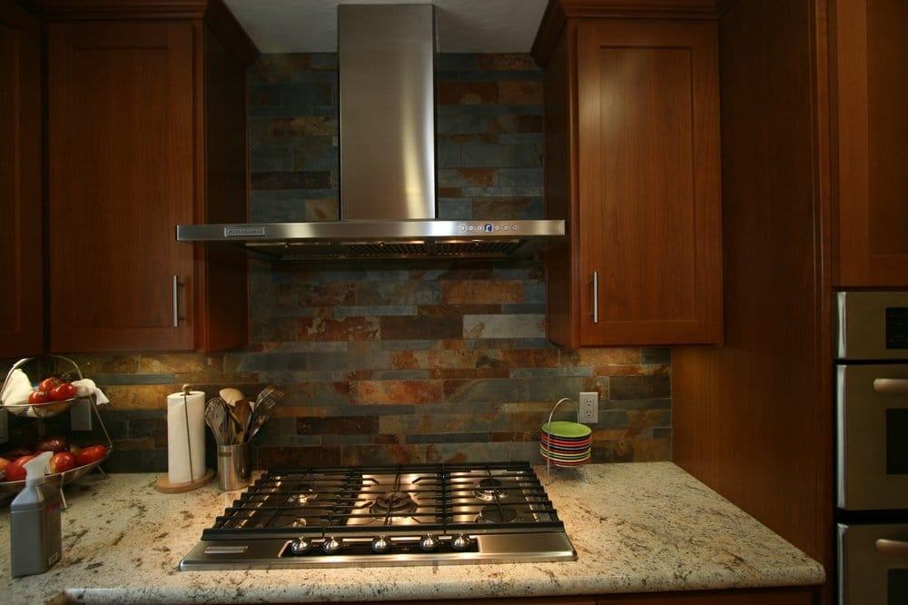 Грубая естественность сланца Multicolor Slate становится все более востребована в современных проектах. Сланцевая отделка "каменная гряда" на фартуке имитирует природное залегание камня, создавая атмосферу близости с природой. Рыжие разводы камня отлично перекликаются с цветом мебельного гарнитура.