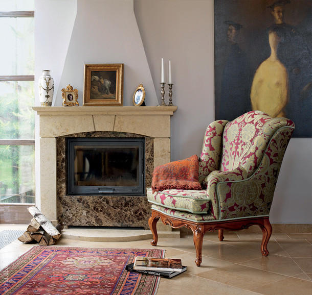 Каминный портал установлен в углу комнаты у окна — необычное расположение, согласитесь? Оригинален и его вид — он изготовлен из двух сортов карбонатных горных пород: бежевого Юрского камня и турецкого мрамора Emperador Dark.