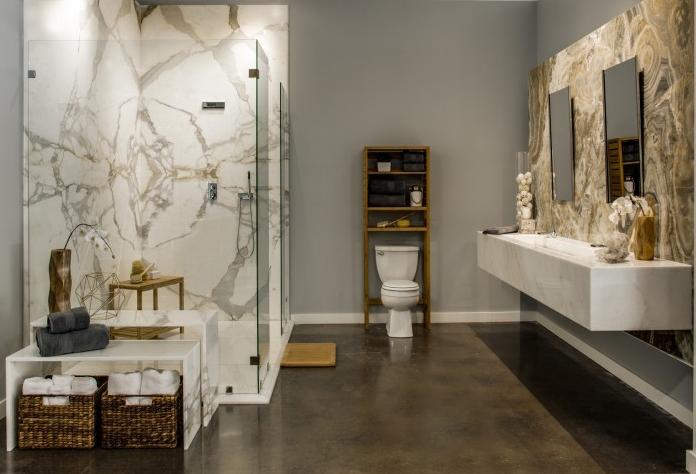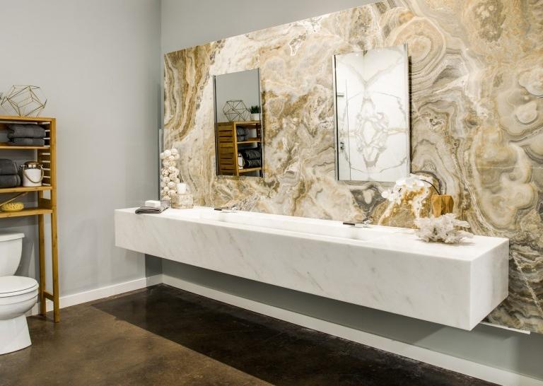 В первую очередь, внимание привлекается стеновой панелью в зоне зеркал. Она выполнена из двух цельных слэбов мраморного оникса Onyx Black Cloud с узорчатым рисунком в серо-бежевой цветовой гамме.