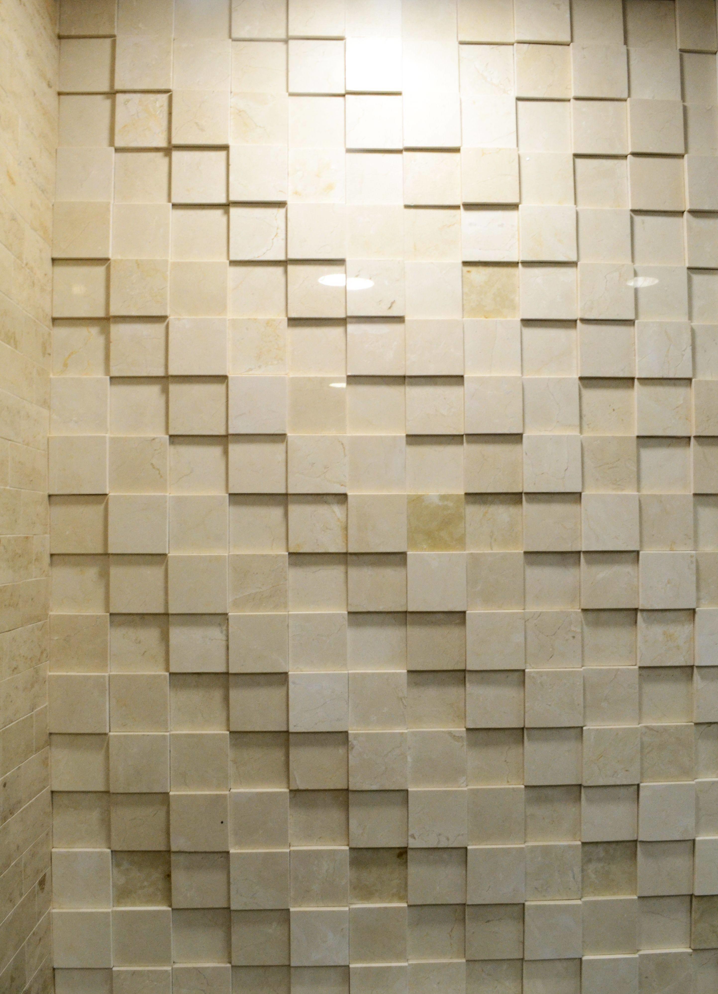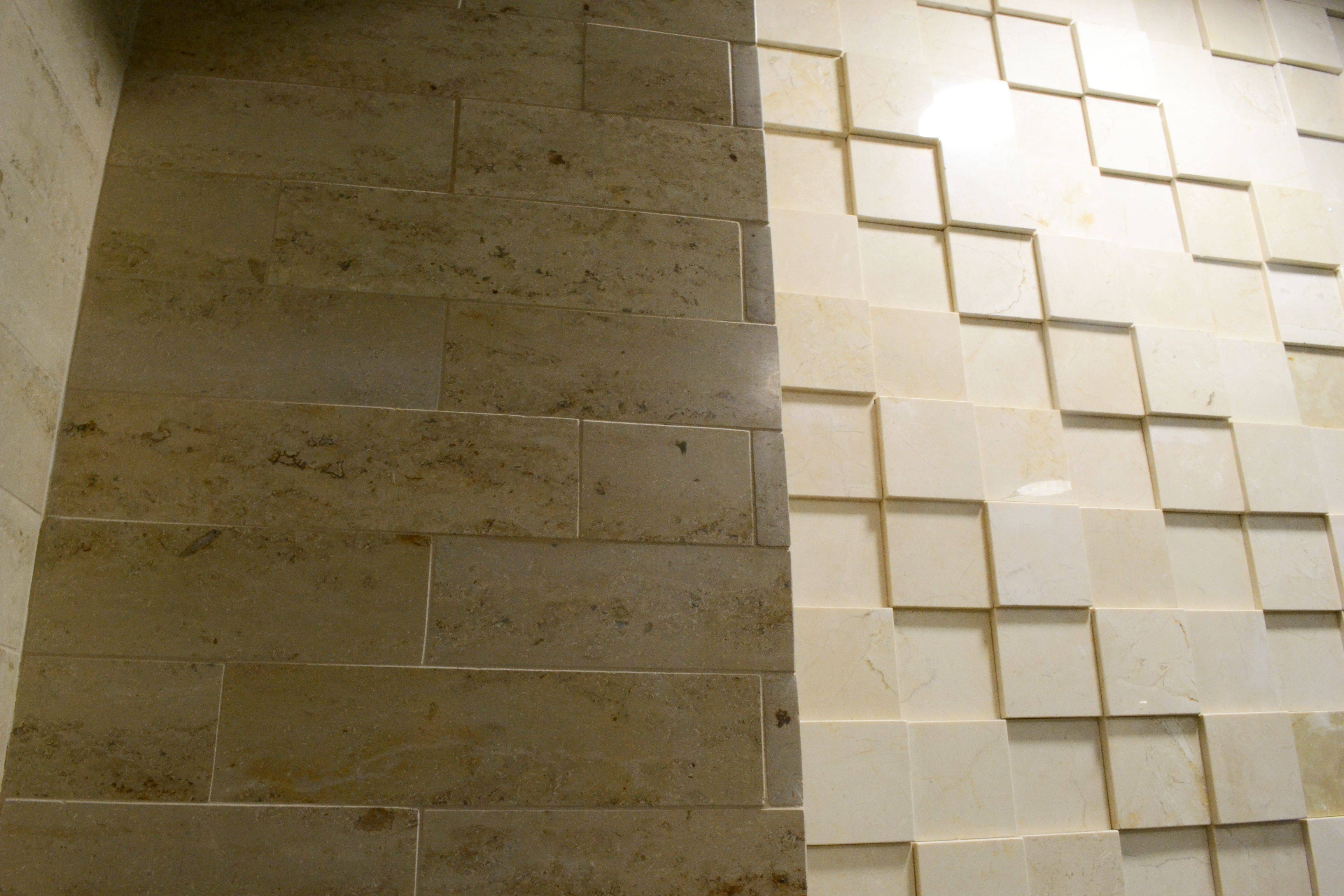 Как правило, чем спокойнее цветовая текстура камня, тем лучше. В данном случае наши мастера очень удачно выбрали материал - кремово-бежевый мраморизованный известняк Crema Marfil. Камень с полированной фактурой создает игривое мерцание квадратных прожилковатых плиток.