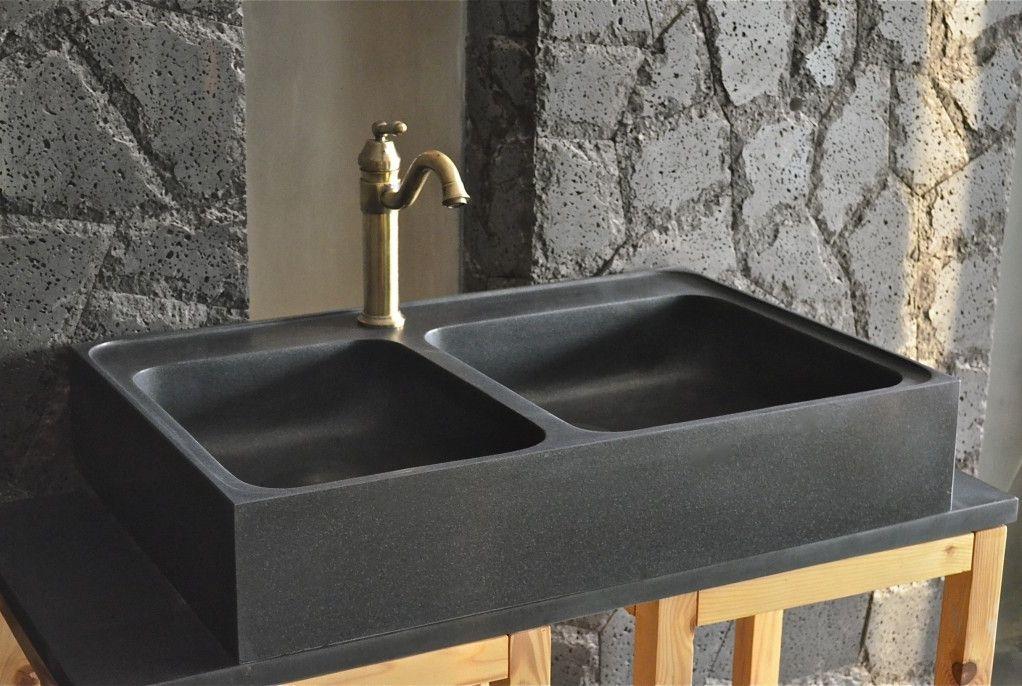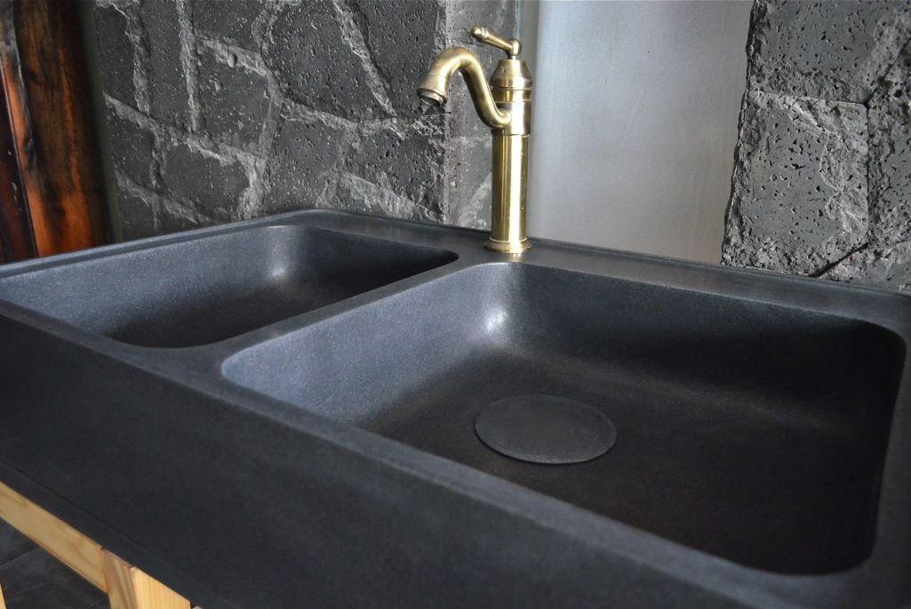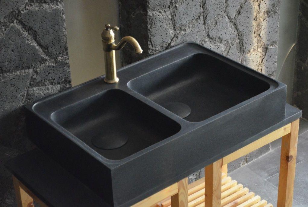 Эта двойная мойка вырезана из толстомера базальта Absolute Black (этот камень также относится к классу черных гранитов).