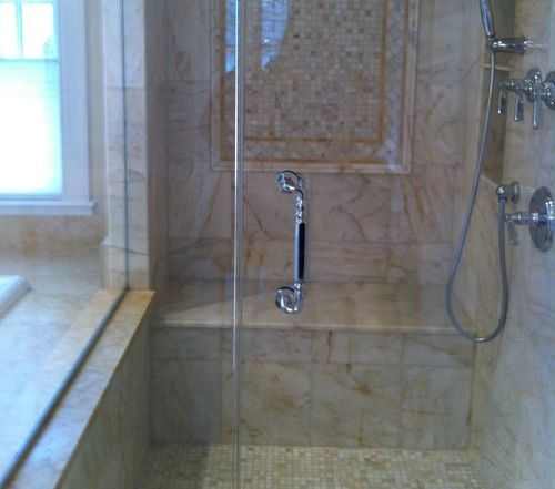 Стены душевой кабины облицованы плиткой турецкого мрамора Afyon Sugar. Им же отделан выступ в стене, выполняющий роль скамейки. Декоративная ниша в стене представляют собой мозаику с применением этого же сорта мрамора.