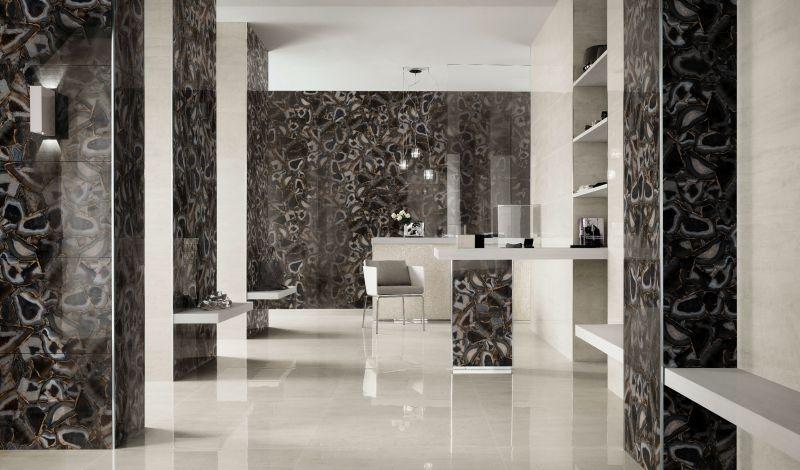 Уникальный проект коммерческого заведения. Белоснежный интерьер контрастирует с Agate Umbra "тигровой окраски", которым облицованы стены.