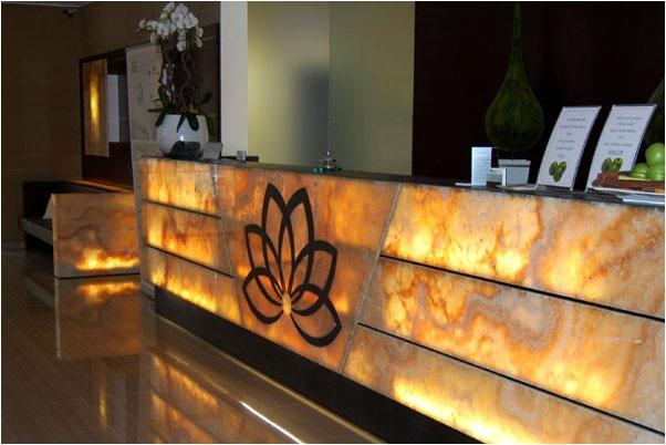Рецепция представляет собой стойку, собранную из деревянного каркаса и облицованную полосами мраморного оникса Alabastro, подсвеченного изнутри. В центре лицевой стенки красуется логотип компании. Этим же ониксом облицовано пространство вокруг скамьи. Квадраты этого камня использованы для создания подсвеченных панно на стене.