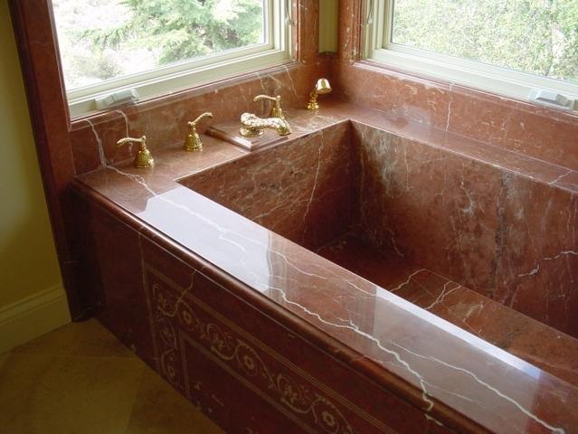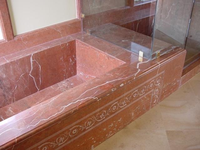 Ванна строгой геометричной формы изготовлена методом склейки из фрагментов мрамора Rosso Alicante. Таким образом, ванна представляет собой фундаментальное изделие, наподобие тех, что два тысячелетия назад украшали императорские купальни. Фасад ванны украшен резной гравировкой с растительным орнаментом.
