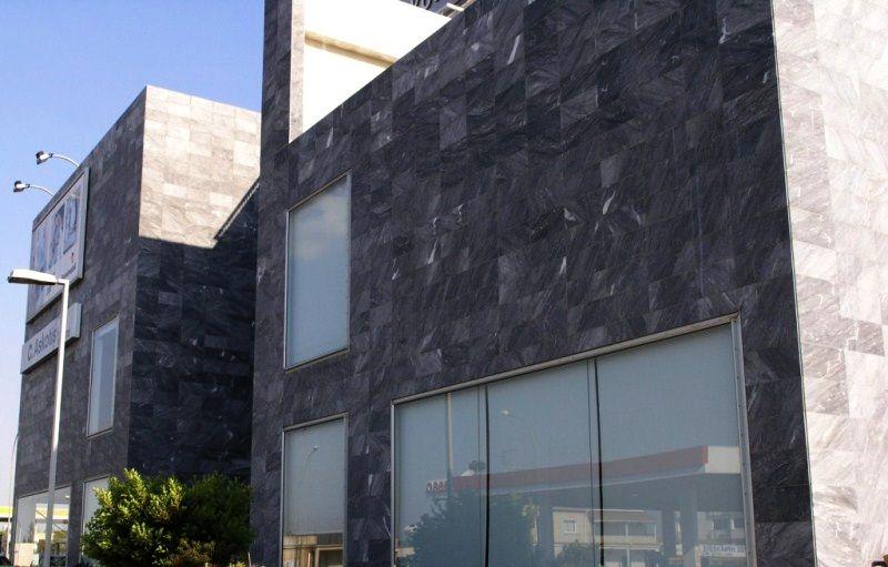 Перед нами современное городское здание в строгой геометричной форме. Единственным элементом, придающим ему выразительность, является отделка - прямоугольной плиткой греческого мрамора Alivery Grey. На голубовато-сером фоне раскиданы миниатюрные волны белых прожилок, которые и придают камню динамичный и живописный вид.