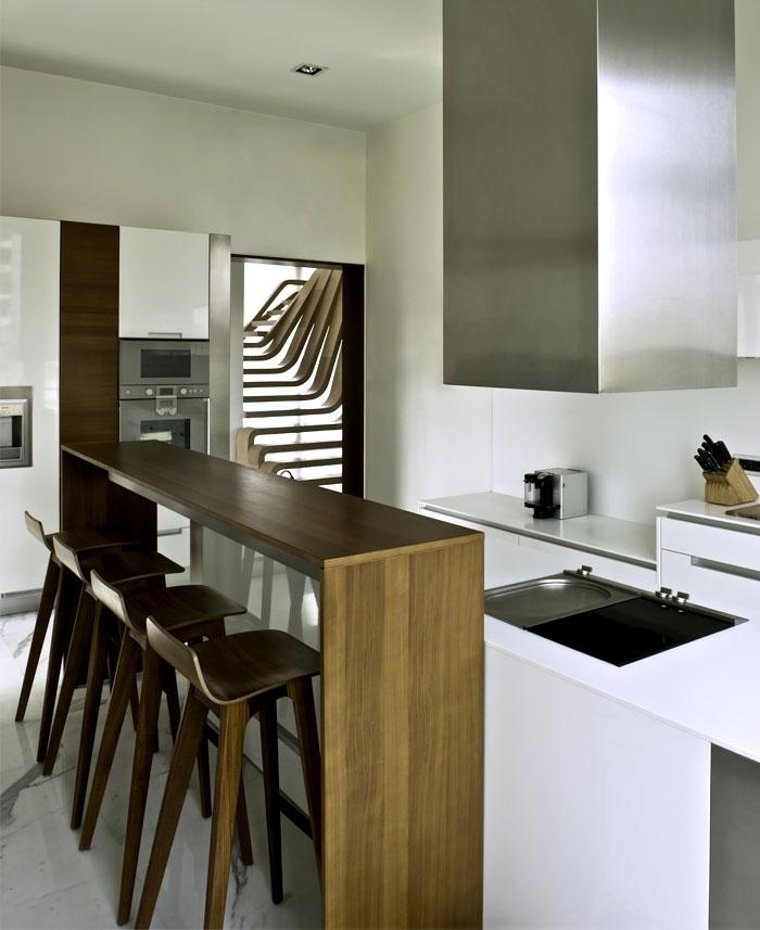 Конечно, ключевым элементом всего пространства - смысловым и связующим, является деревянная лестница. Волнообразная, плавная, "перетекающая". Создается впечатление, что архитектор смог преодолеть природную твердость дерева, сделав его гибким и пластичным, принимающим любую форму, как вода.