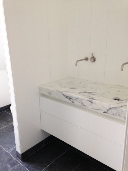 Эта раковина выполнена из толстомера классического итальянского мрамора Arabescato Vagli. В плите вырезаны две неглубокие впадины и отверстия для слива воды. Фактура поверхности камня - лощение - бархатистое, без блеска. Перед эксплуатацией изделие было обработано профессиональной гидрофобной пропиткой, которая защищает его от образования стойких пятен.