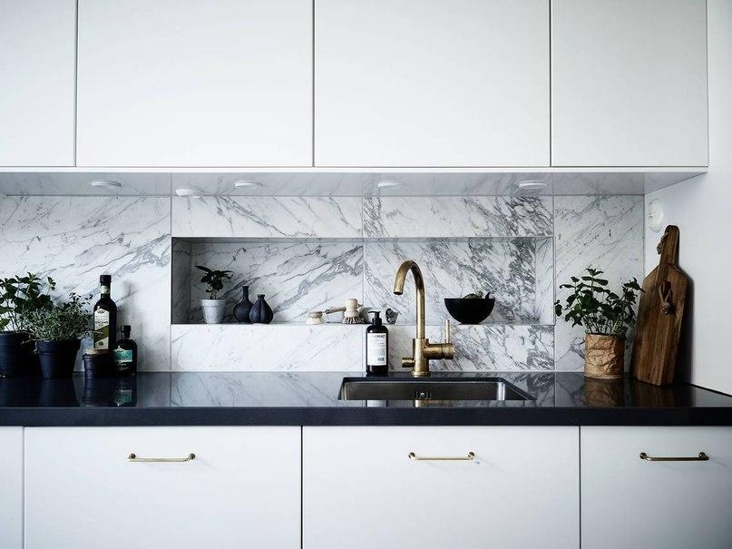 Зона фартука с нишей облицована легендарным итальянским мрамором Arabescato Vagli - белоснежным, с густой сетью широких голубовато-серых прожилок. Диаметральная направленность рисунка придает пространству динамику, наполняя его энергетикой.