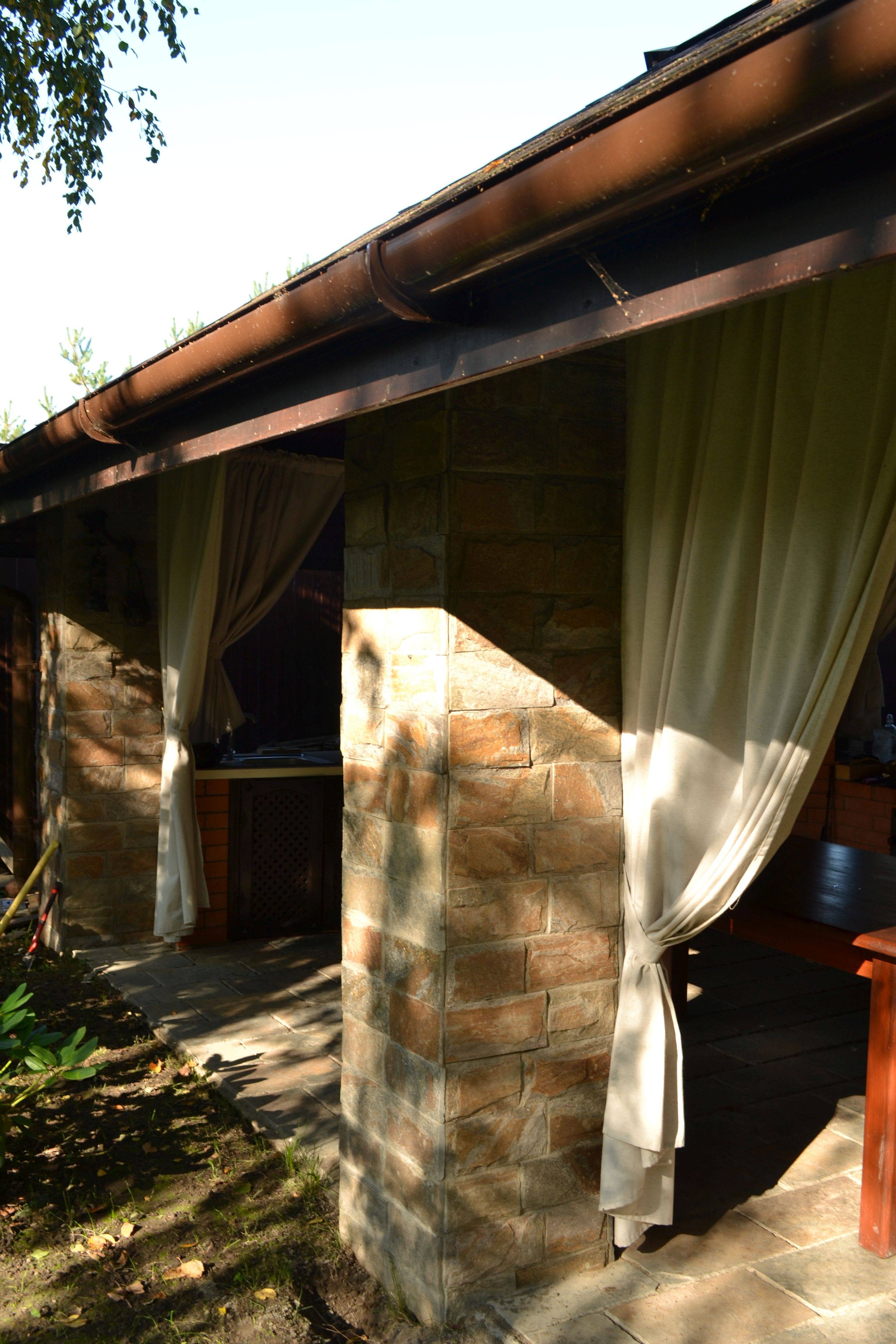 Плиткой кварцитосланца облицованы опорные квадратные колонны. Он же использовался для мощения пола в беседке. Этот камень - один из самых популярных материалов для реализации ландшафтных проектов, поскольку он прекрасно выдерживает любые климатические условия, не истирается и устойчив к загрязнениям и влажности.