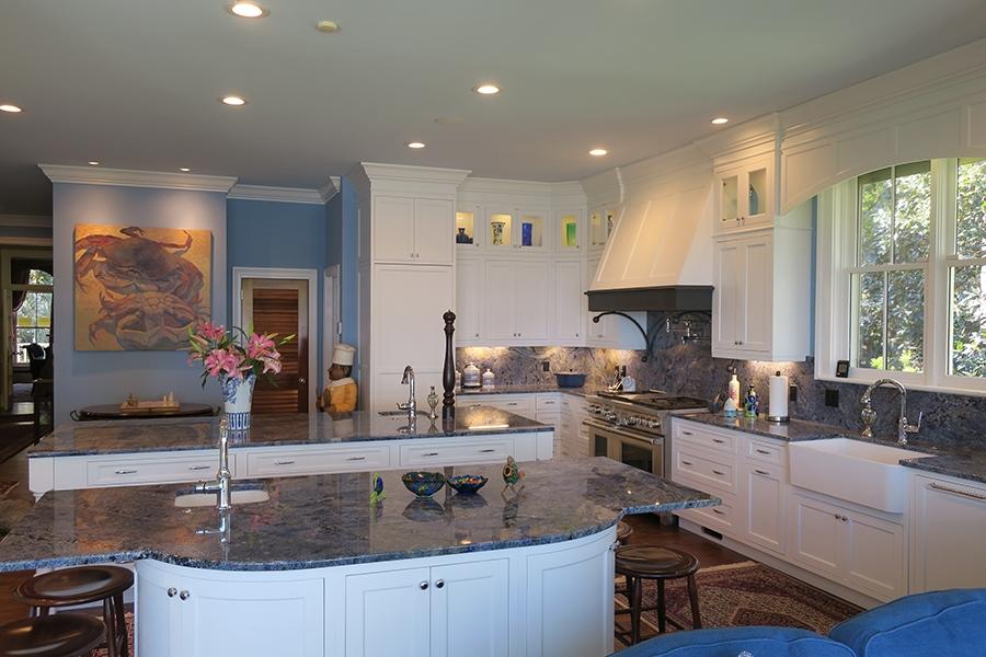Из этого камня выполнены все столешницы - как для рабочих зон по периметру кухни, так и для двух островов. В формате крупных фрагментов камень также задействован и для покрытия фартуков.