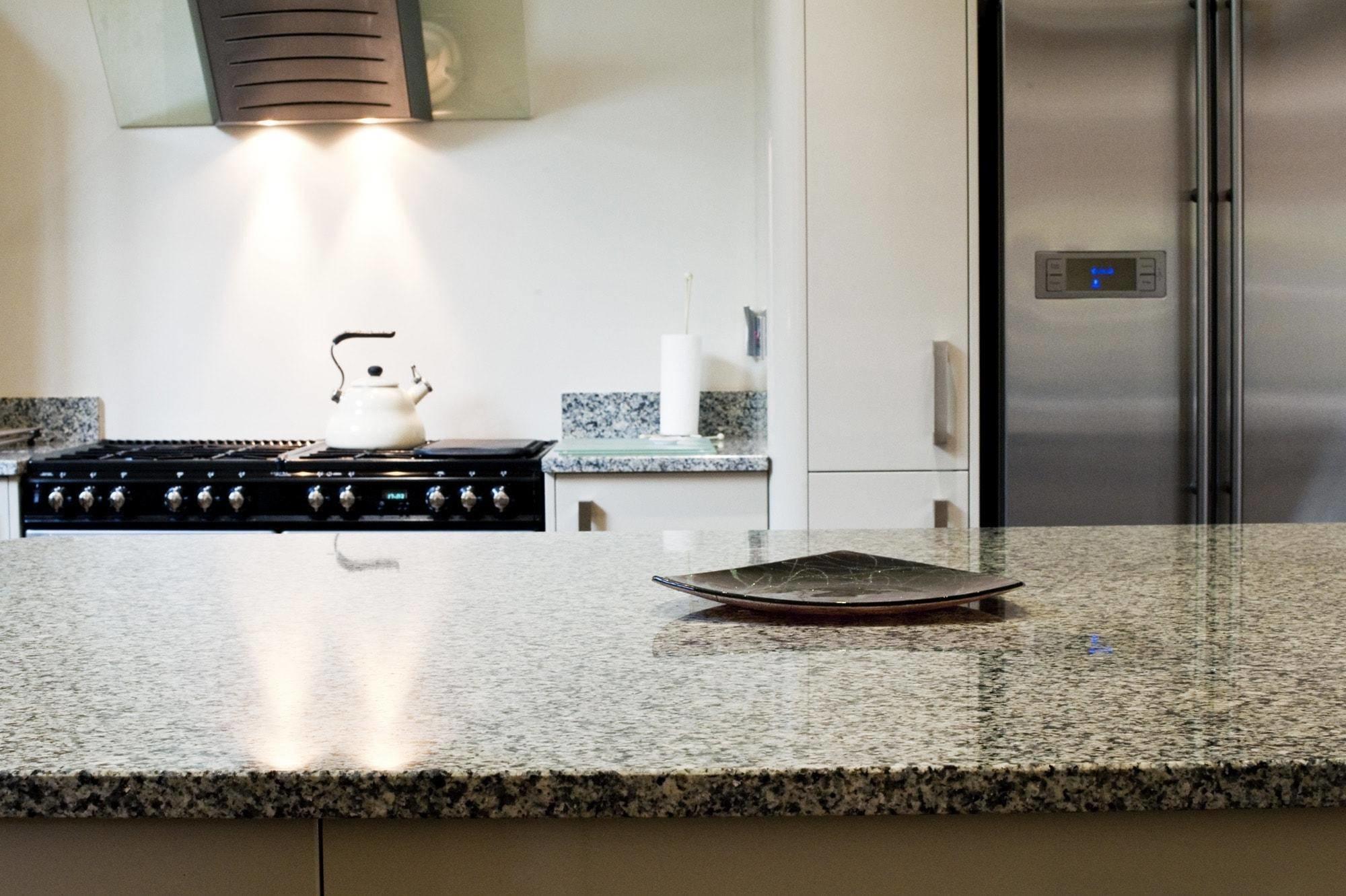 Столеницы этой светлой кухни выполнены из гранита Azul Platino - голубовато-белого с четким и частым рисунком темно-серых зерен. Этим камнем покрыты поверхности рабочей зоны, а также центрального стола. Из него же выполнены невысокие плинтусы, обрамляющие столешницы по стене. У окна каменный плинтус переходит в простой и массивный подоконник.