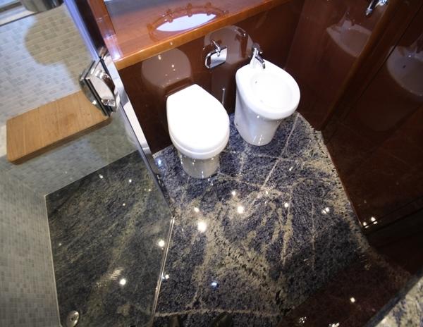 Квадратной плиткой гранита Azul Bahia выложен пол в маленькой ванной комнате. Из слэба этого же гранита изготовлена столешница, обрамляющая раковины.