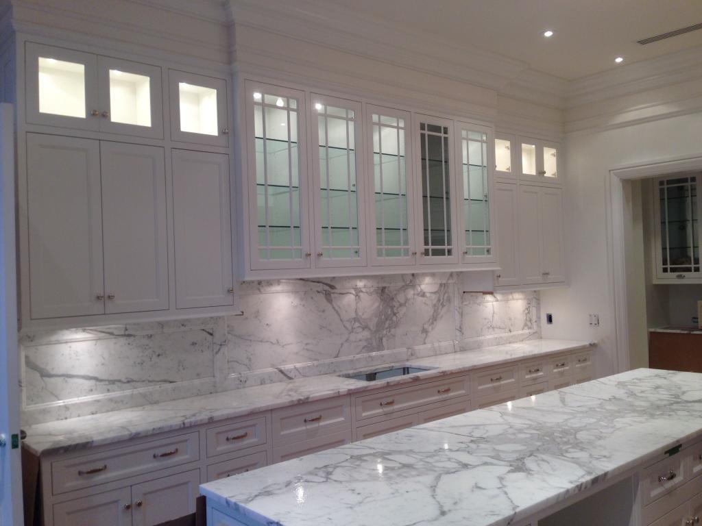 Из этого мрамора выполнен сложный рельефный фартук, изготовленный методом склейки элементов. Из него же вырезаны поверхности двух столешниц.