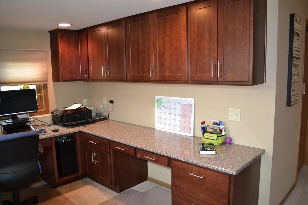 Столешница рабочей зоны этой кухни (которая в процессе переезда пока что играет роль кабинета) выполнена из полированного трехсантиметрового слэба гранита Bainbrook Brown.