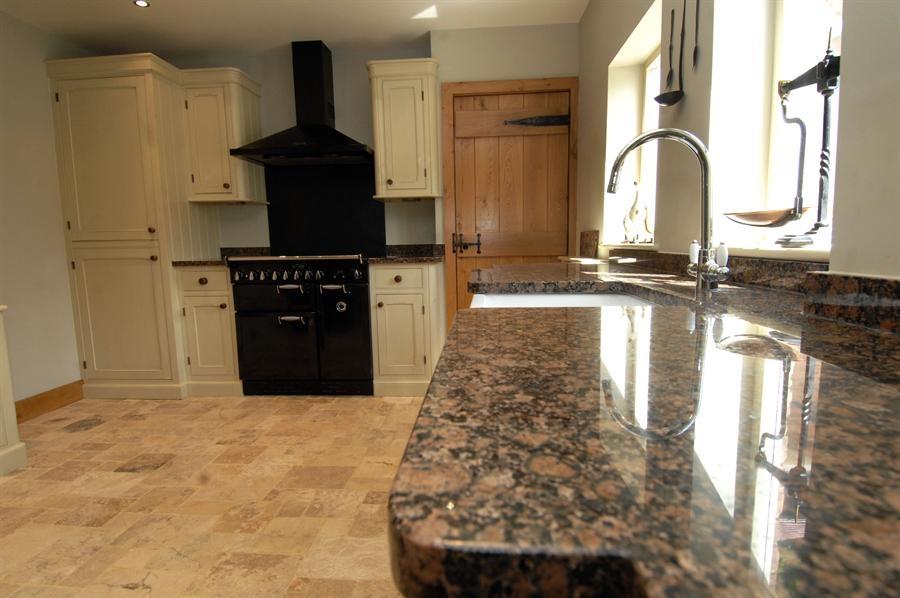 Рабочие поверхности кухни покрыты гранитом Baltic Brown - надежным и проверенным камнем. Финский гранит-рапакиви Baltic Brown широко востребован не только в странах Европы, но даже и в США. Где зачастую слагает именно кухонные столешницы. Дизайнеры и заказчики высоко ценят его за устойчивость перед загрязнениями, влагой и механическими повреждениями.