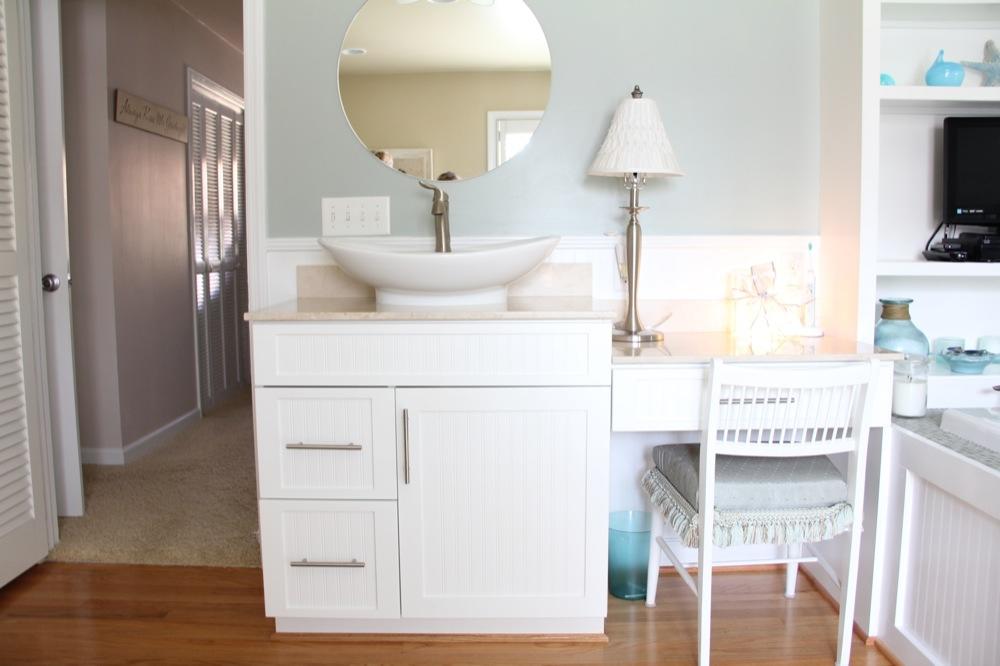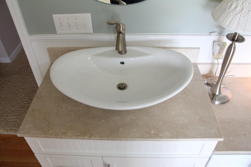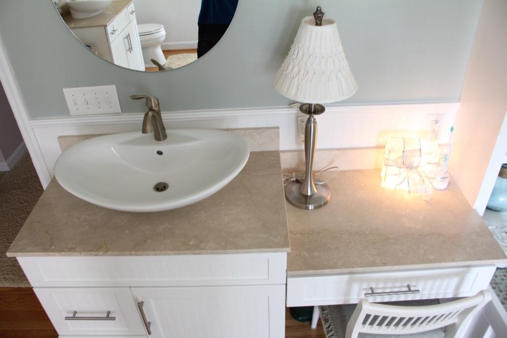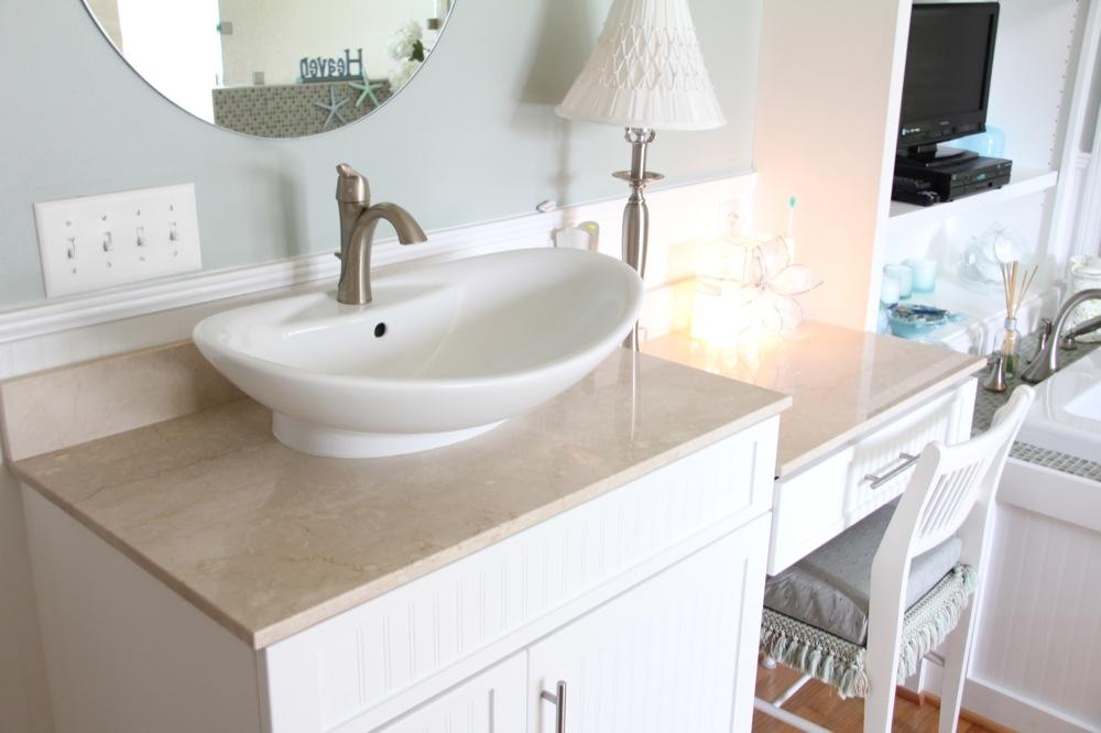 Мы видим необычный для спальни элемент мебели - туалетный столик с раковиной. Он представляет собой комод и низкую тумбу. Поверхность изделия покрыта столешницами из Botticino Fiorito. Этот элегантный нежно-бежевый мрамор органичен в любом интерьере. Но в сочетании с элегантными элементами декора в пастельной гамме он смотрится единственно возможным!