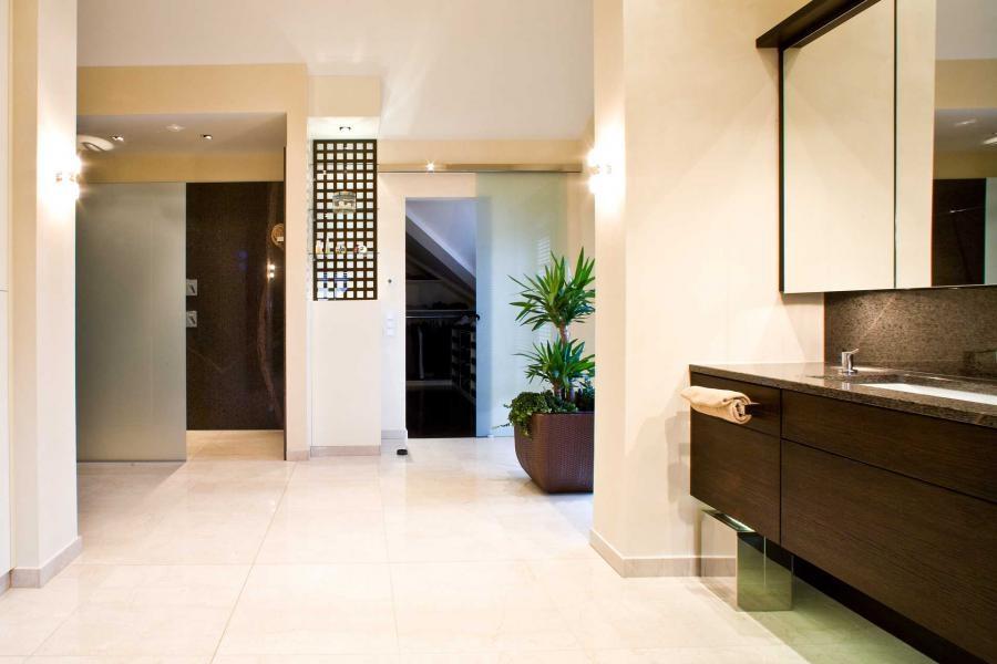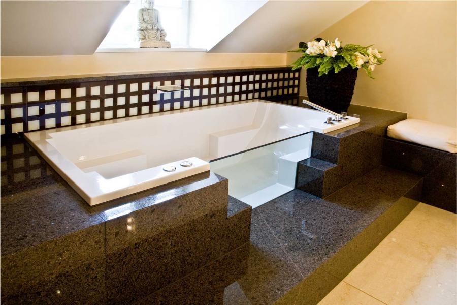 Светлые стены главного помещения контрастируют с гранитом Cafe Imperial, из которого выполнен постамент для ванной, столешницы под раковины и фартуки. Обратите внимание на постамент сложной геометрии: лестничные элементы и полированная фактура заметно повышают презентабельность такого изделия! Скромный, но притягательный рисунок камня смотрится веьсма уместно. Но стоит отметить и его прочностные характеристики - такая отделка вероятнее всего станет многовековой семейной реликвией.