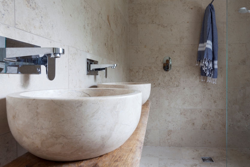 Круглые раковины вырезаны из полированного мрамора Crema Nova, обладающим интересной текстурой и нежным кремовым оттенком.