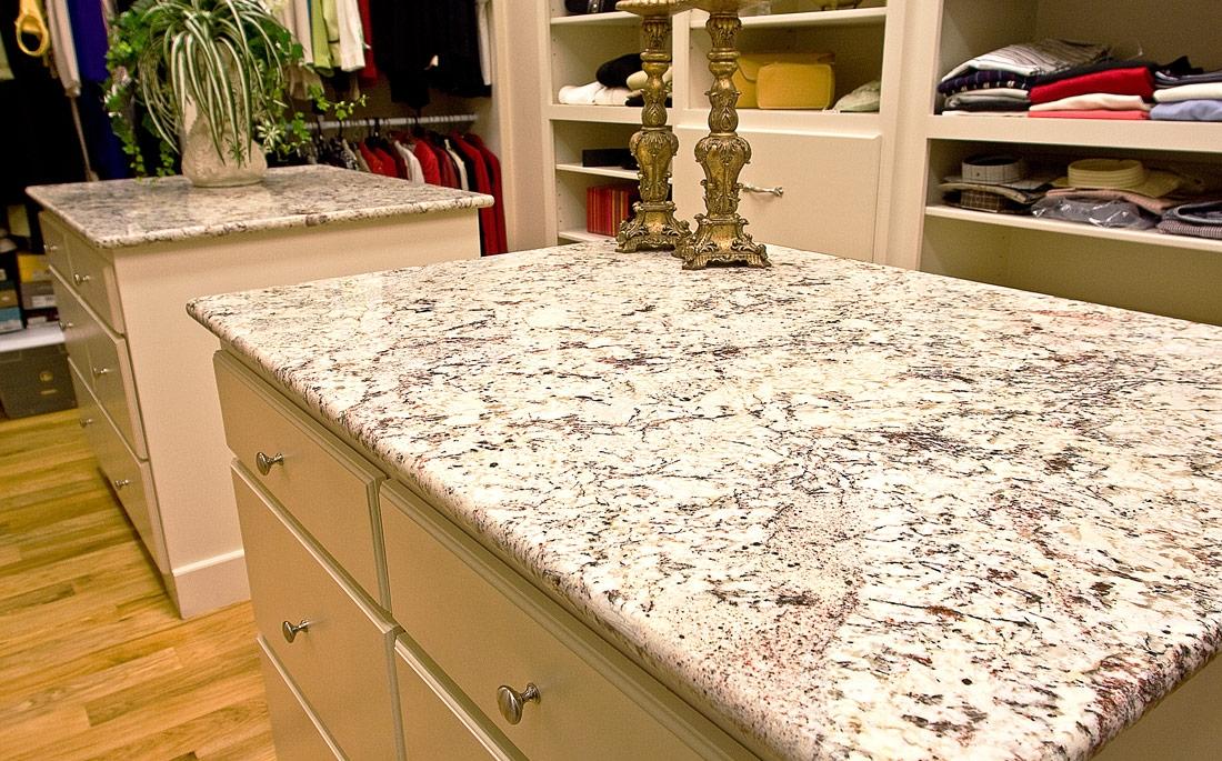 В гардеробной, расположенной рядом с ванной, поверхности тумб также покрыты этим удивительным гранитом.