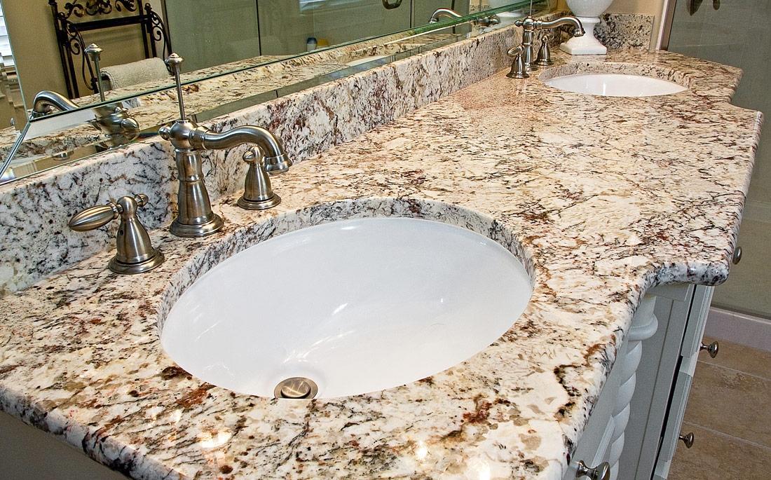 Секрет гармонии интерьера ванной заключен в отточенном классическом стиле. Элегантная белая мебель, бежевые стены и пол, теплое освещение прекрасно сочетаются со столешницами из гранита Bianco Antico. Естественная цветовая гамма камня, динамичный графический рисунок темных прожилок, вишневые включения минерала граната - яркая красота этого камня органична в любом проекте.