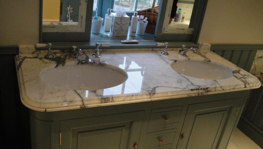 Bianco Statuario использован для создания столешницы под раковины, а также для облицовки стен и пола в примыкающей душевой кабине.