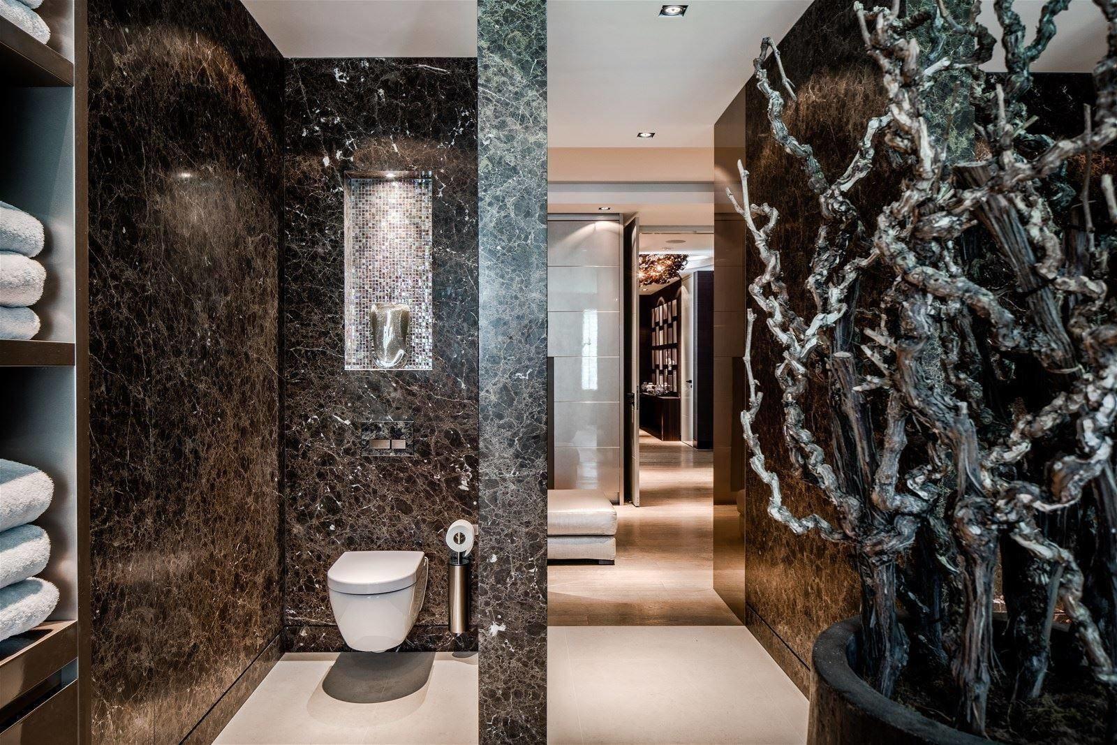 Главным декоративным элементом этого проекта является повсеместная облицовка элегантным мрамором Emperador Dark. Прожилковатая текстура камня шоколадной гаммы смотрится выразительно и благородно. Лощеная поверхность приобрела вид изысканной состаренности.