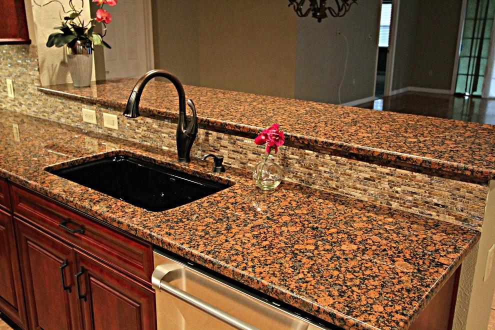Этот крупнозернистый камень с однородным рисунком круглых кристаллов обладает приятным теплым розовато-коричневым тоном. Такой оттенок органичен в любой окружающей среде и любой стилистике. Но мебель из красного дерева - особенно удачный союзник для создания уютного домашнего интерьера.
