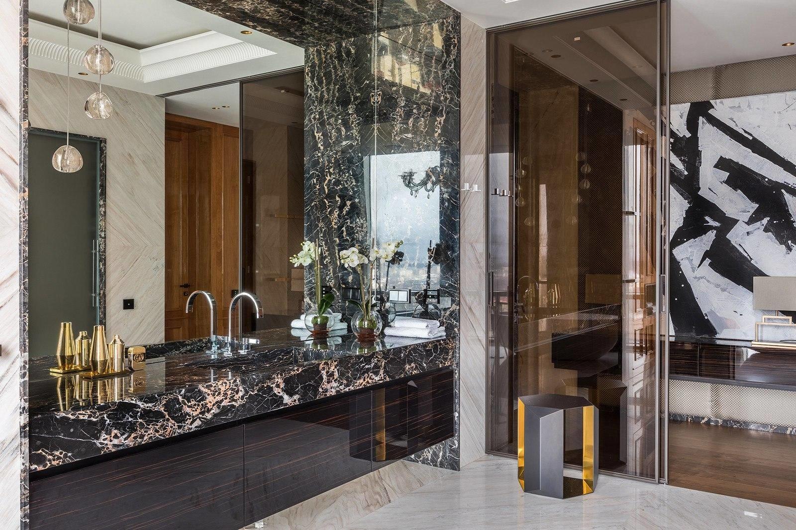 Перед нами уникальный авторский проект московских дизайнеров. Заказчик интерьера - человек с широким кругозором, вдохновляющийся интерьерами лучших отелей по всему миру. Пытаясь воссоздать роскошь пятизвездочных отелей, дизайнер обращался лишь к дорогим сортам камня и дерева и заказывал мебель люксовых марок.