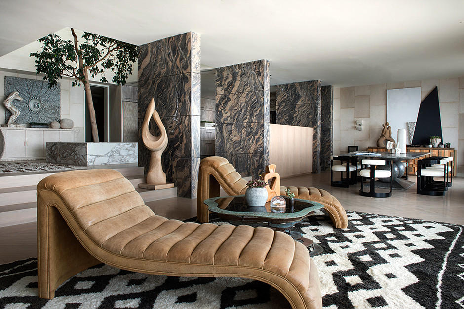 А особенно фундаментально и продуманно смотрится массивный каминный портал из мрамора Arabescato Orobico Grigio. Он занимает сердце гостиной и простирается почти от пола до потолка. Обрамляя каминную топку снизу портал разрастается, фрагментарно выдаваясь в объемное сооружение. Портал склеен из множества элементов, карнизов, рам. Это поистине произведение искусства, воплощенное в редком итальянском мраморе. Этим же камнем облицованы крупные прямоугольные колонны-панели.