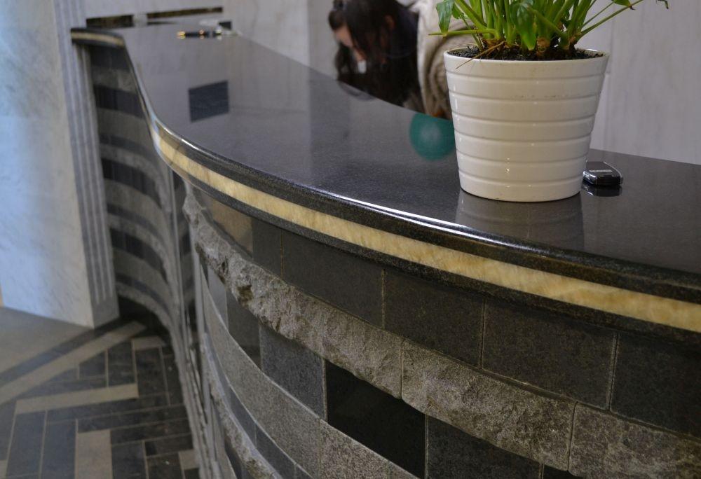 При входе в наш офис Вас встречает необычная стойка-ресепшн, облицованная природным камнем.